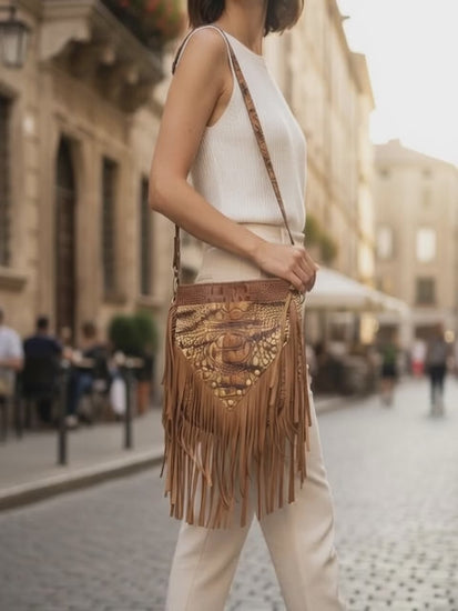 This one of a kind cognac, sand and camel designer all leather shoulder bag is a statement piece that combines elegance with a touch of wild charm. With fringe that flows with every move, it has an effortless chic and bohemian style.