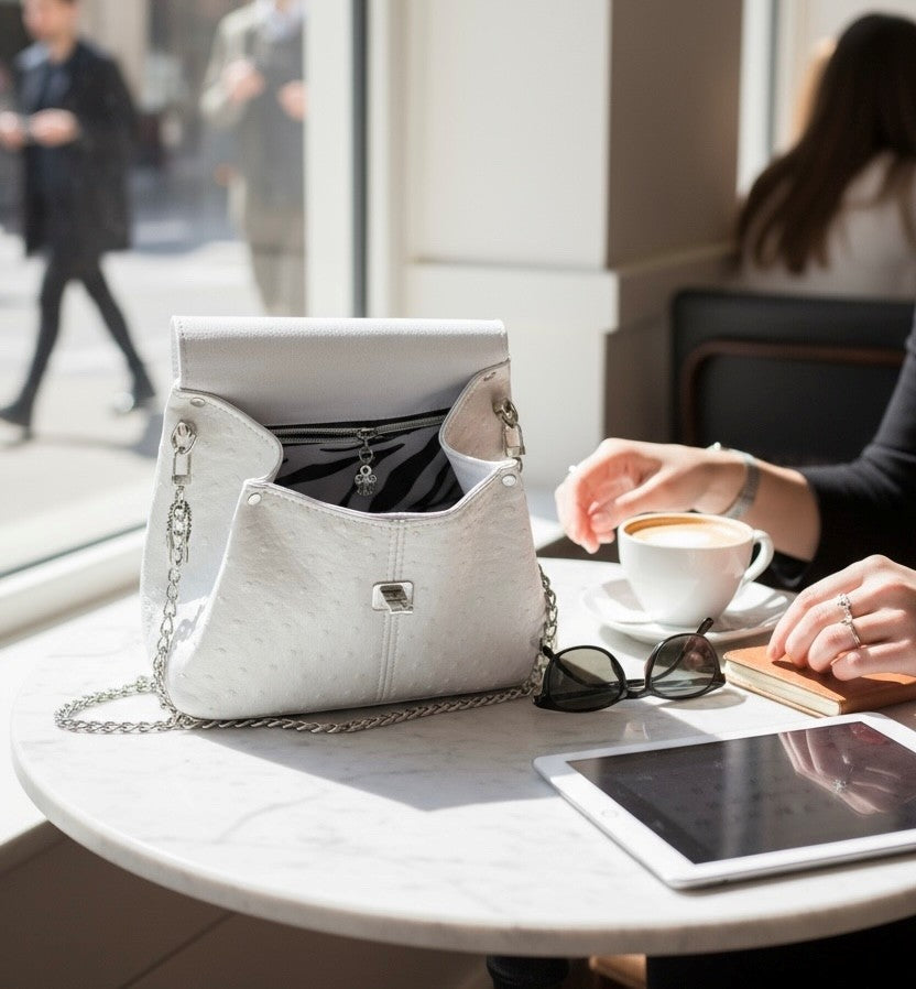 White Ostrich and Zebra Stripe pairs perfect together; they are both unique, beautiful and luxurious. The chic, sleek design is simple, yet eye catching. The bag is secured by an elegant flap closure with a designer-quality lock, providing both security and a luxe aesthetic.
